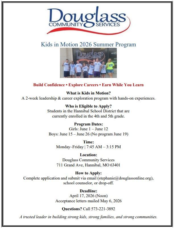 Submit a completed application to Douglass Community Services @ 711 Grand, Hannibal OR return to your school office by Noon on April 11,2025. Click below to download an application. Other Questions? Call 573-221-3892 for more information.